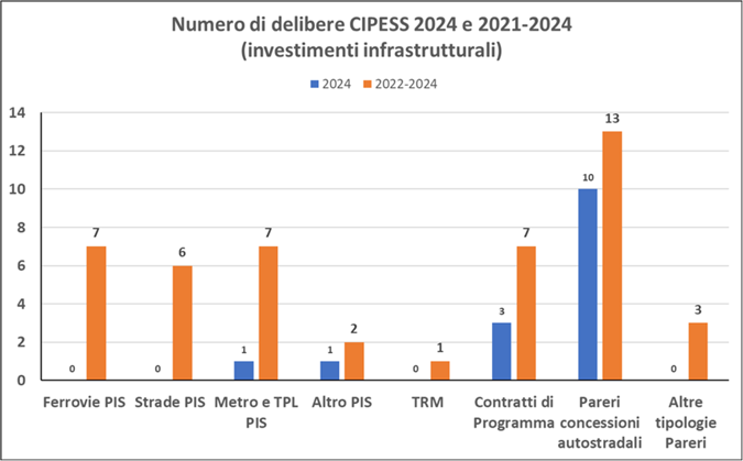 - Altri PROGETTI INFRASTRUTTUALI (incluso MOSE, settore idrico/elettrico, porti, giacimenti idrocarburi, etc.): 1 delibera relativa al settore portuale (Porto di Trieste) approvata nel 2024 e 2 nel triennio 2022-24.