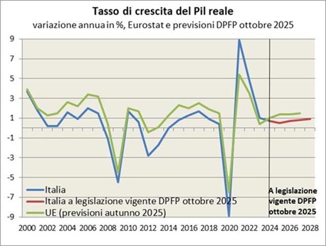 Nota esplicativa: Il dato è riferito al tasso di crescita del Prodotto interno lordo (PIL) dell’Italia e a quello medio dell’Unione europea. Per il 2024-2027 è indicato il dato delle previsioni a legislazione vigente del DPFP di ottobre 2025 e delle previsioni della Commissione europea di autunno 2025.