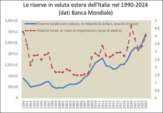 Nota esplicativa: Il grafico riporta il valore delle riserve in valuta estera dell’Italia, sulla base di dati annuali della Banca mondiale. Sono riportati sia il valore nominale in miliardi di dollari correnti delle riserve italiane (incluso il valore delle riserve in oro detenute dalla Banca d’Italia), che il suo equivalente misurato in mesi di importazioni al valore corrente, misura che tiene conto dell’andamento dei prezzi delle esportazioni.