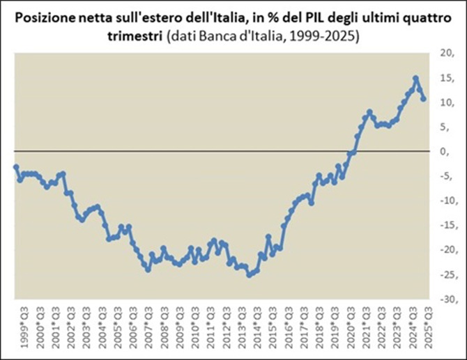 Nota esplicativa: Il grafico riporta la posizione netta sull’estero dell’Italia, sulla base di dati trimestrali della Banca mondiale. Quando il grafico ha un valore negativo l’Italia si trova in una posizione di debito netto nei confronti dell’estero, mentre il valore positivo significa che l’Italia è un creditore netto rispetto al resto del mondo.