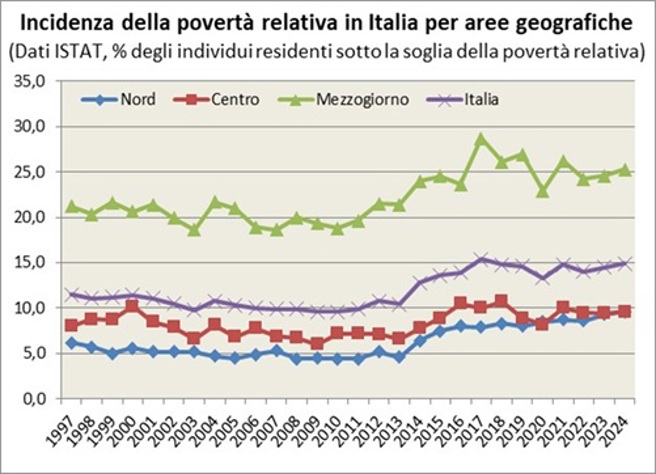 Nota esplicativa: L’incidenza della povertà relativa viene calcolata sulla base di una soglia convenzionale (linea di povertà) che individua il valore di spesa per consumi al di sotto del quale una famiglia viene definita povera in termini relativi. Tale valore si modifica solo in funzione del numero di componenti del nucleo familiare (e, contrariamente alla povertà assoluta, non è differenziata per zona geografica, dimensione del comune di residenza o età dei componenti del nucleo familiare). L’Istat ha ricalcolato una nuova serie che dal 2014 non è in continuità con la precedente serie.