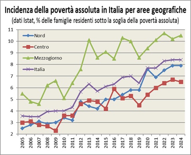 Quota di popolazione in povertà assoluta per aree geografiche