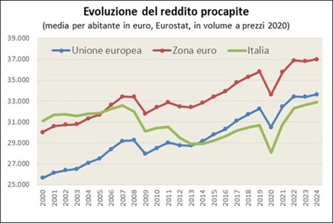 Nota esplicativa: Il grafico confronta i dati relativi al reddito pro capite in euro (misurato in termini di PIL pro capite) in Italia con quello medio dell’area euro e dell’Unione europea a 28 membri. I dati non sono espressi a prezzi correnti ma in funzione dei volumi concatenati a prezzi 2020.