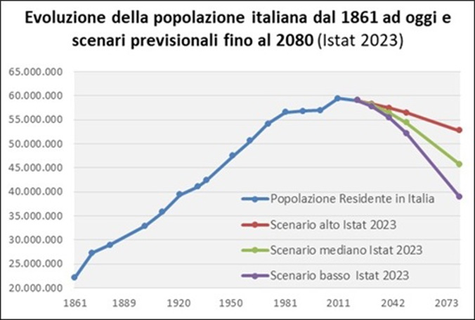 Nota esplicativa: Il grafico mostra l’evoluzione della popolazione complessiva residente in Italia secondo i censimenti condotti dal 1861 al 2011 (italiani e stranieri), come ricostruita dall’Istat. Dal 2020 vengono riportati nel grafico tre scenari previsionali demografici sviluppati nel 2023 dall’Istat fino al 2080, con la mediana quale valore centrale, oltre a due scenari alto e basso nell’intervallo di confidenza del 90% rispetto allo scenario mediano.