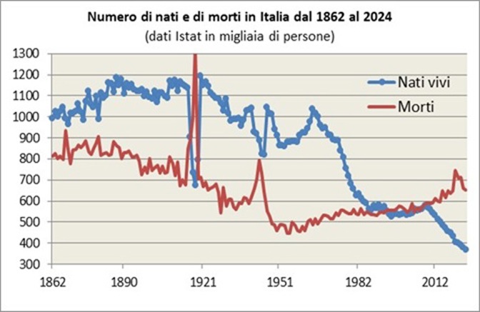 Nota esplicativa: Il grafico mostra l’evoluzione del numero assoluto di nati vivi e di morti in Italia dal 1862 al 2024.