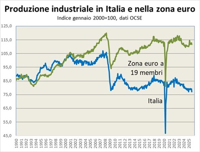 Nota esplicativa: L’indice della produzione industriale misura la variazione nel tempo del volume fisico della produzione effettuata dall’industria in senso stretto (ovvero con esclusione delle costruzioni). Le serie sono state calcolate prendendo come base il primo mese del 2000, posto uguale a 100, con dati mensili OCSE.