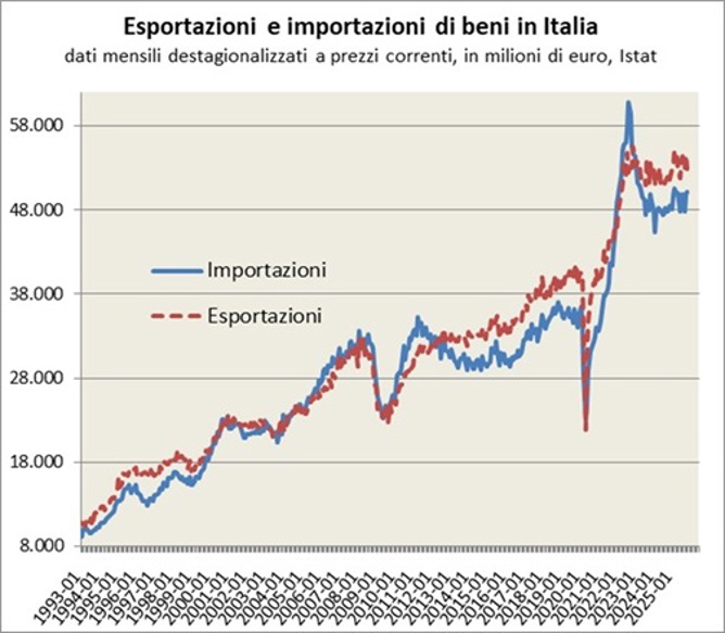 Nota esplicativa: Il grafico riporta l’evoluzione delle importazioni e delle esportazioni italiane di merci da e verso tutto il mondo, valutate a prezzi correnti. I dati mensili sono espressi in milioni di euro a prezzi correnti, destagionalizzati dall’Istat.