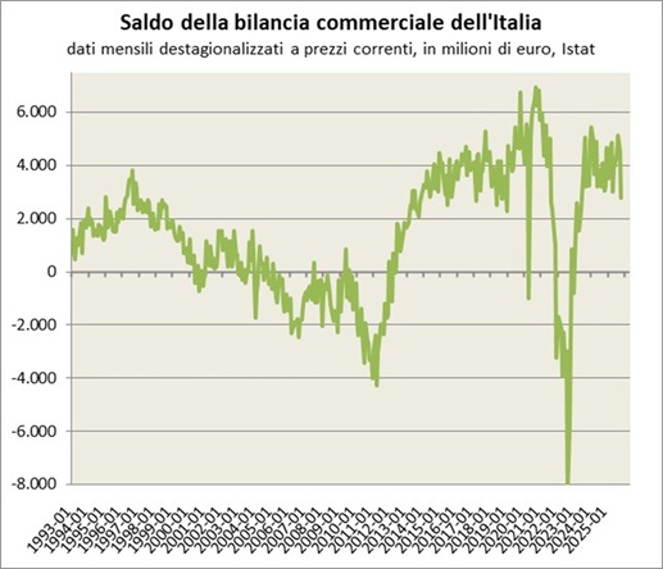 Nota esplicativa: Il grafico riporta mensilmente il saldo negli ultimi quindici anni della bilancia commerciale (saldo tra esportazioni e importazioni di beni e servizi). I valori sono destagionalizzati e espressi in milioni di euro correnti.