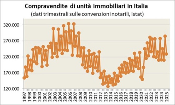 Nota esplicativa: Il grafico illustra l’andamento, fortemente oscillante in funzione della stagionalità, del numero di compravendite di unità immobiliari registrate con convenzioni notarili dal 1997 ad oggi.