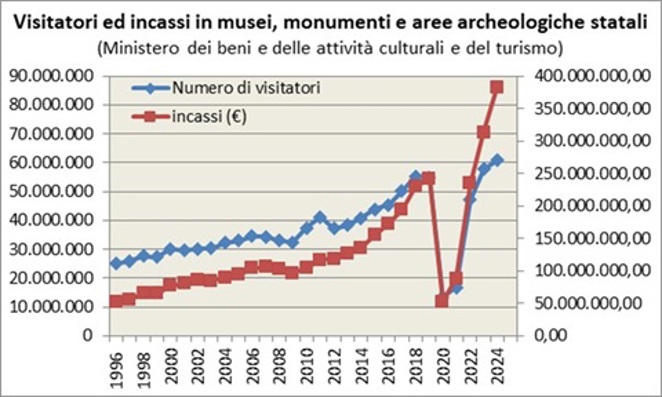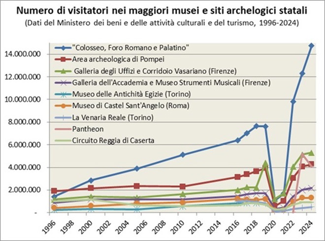 Nota esplicativa: Il grafico mostra l’evoluzione del numero di visitatori nei maggiori musei e siti archeologici statali in Italia dal 1996 al 2024, secondo i dati del Ministero della cultura.
