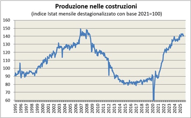 Nota esplicativa: Il grafico mostra l’evoluzione dell’attività della costruzione edilizia tramite l’indice Istat di produzione nelle costruzioni con dati mensili da gennaio del 1995 ad oggi. L’indice è a base 100 nel 2015.