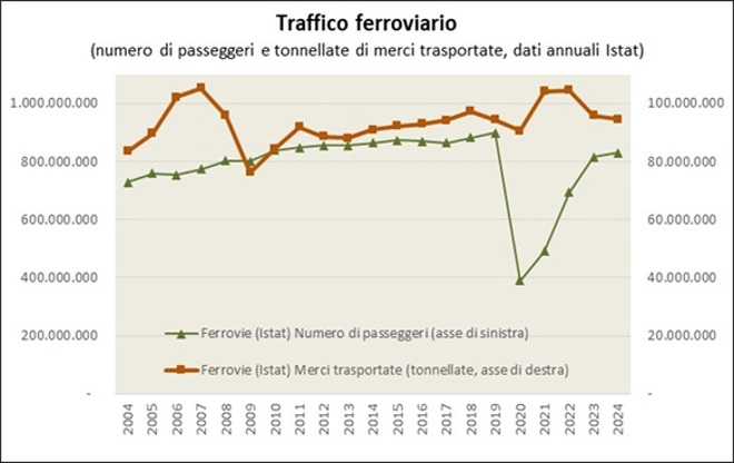 Nota esplicativa: Il grafico mostra l’evoluzione del numero di passeggeri e del volume merci, in tonnellate traportate via ferrovia in Italia dal 2004 al 2023, secondo i dati annuali dell’ISTAT.