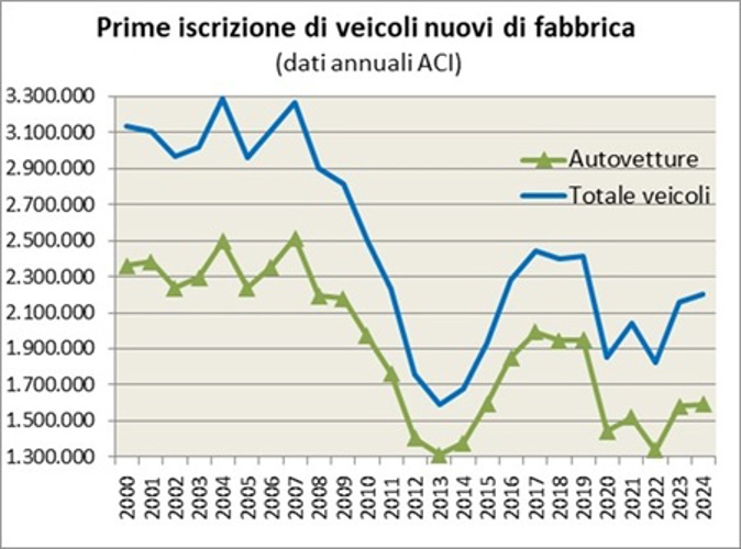 Nota esplicativa: Il grafico mostra il livello di nuove iscrizioni di veicoli in Italia dal 2000 al 2024 utilizzando i dati ACI relativi sia alle autovetture che a motocicli, autobus, camion e altri veicoli.