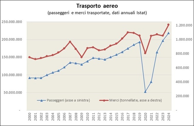 Nota esplicativa: Il grafico mostra l’evoluzione del numero di passeggeri e del volume merci, in tonnellate traportate via aerea in Italia dal 2000 al 2024, da e per tutto il mondo, inclusi i voli di linea e charter, interni e internazionali, secondo i dati annuali dell’ISTAT.