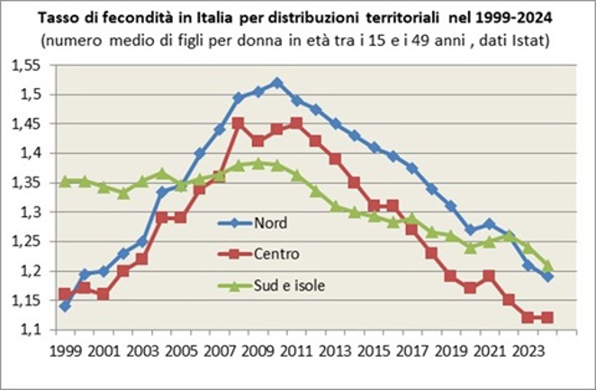 Nota esplicativa: Il grafico mostra l’andamento del numero medio di figli per donna in età fertile, convenzionalmente definita tra i 15 e i 49 anni, nel Nord, Centro e Mezzogiorno d’Italia.